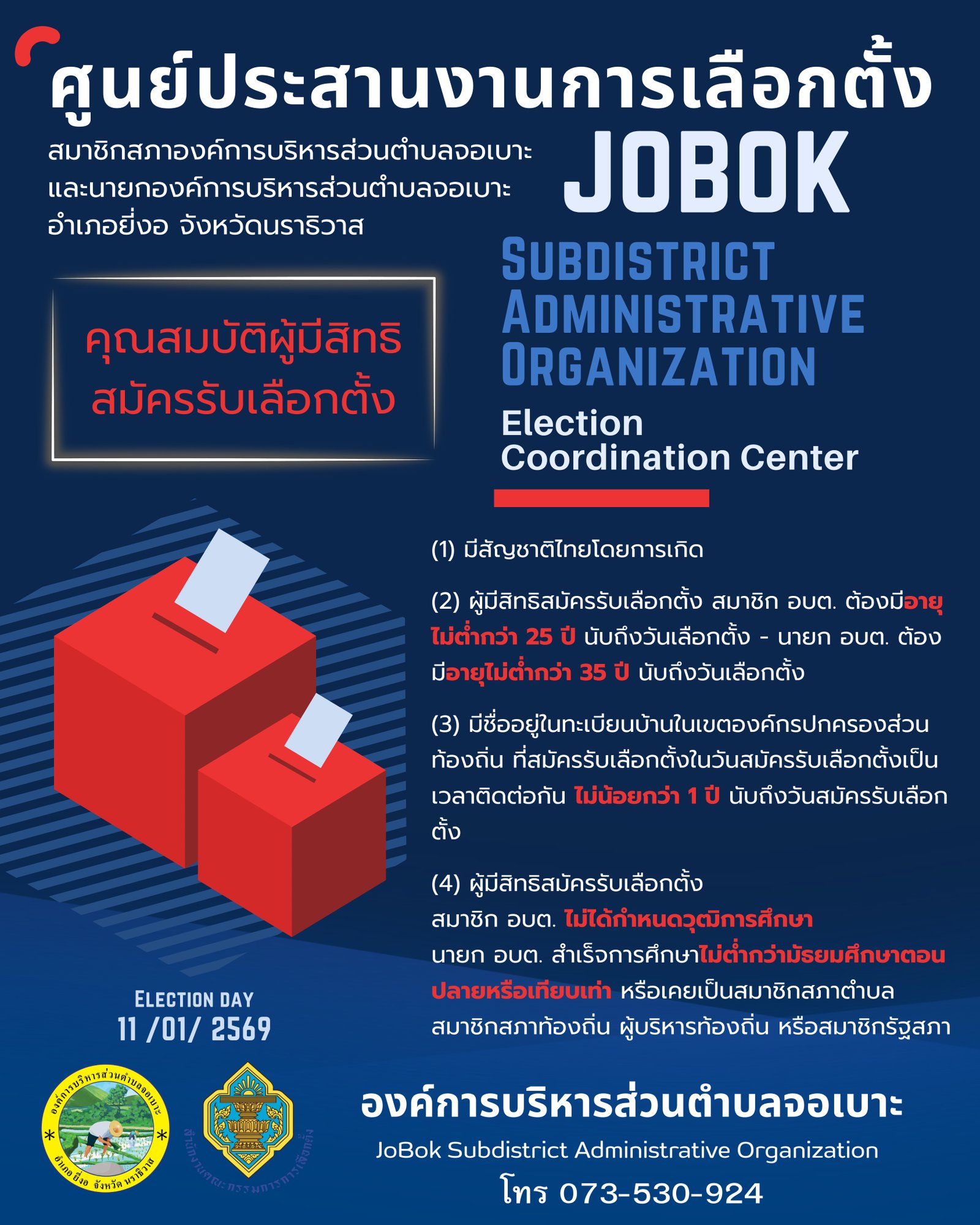 ประกาศองค์การบริหารส่วนตำบลจอเบาะ เรื่อง ประกาศรายชื่อผู้มีสิทธิเข้ารับการสรรหาและเลือกสรรเป็นพนักงานจ้าง ขององค์การบริหารส่วนตำบลจอเบาะ ประจำปีงบประมาณ 2569 กำหนดวัน เวลา สถานที่สอบ และระเบียบเกี่ยวกับการเข้ารับการสรรหาและเลือกสรร