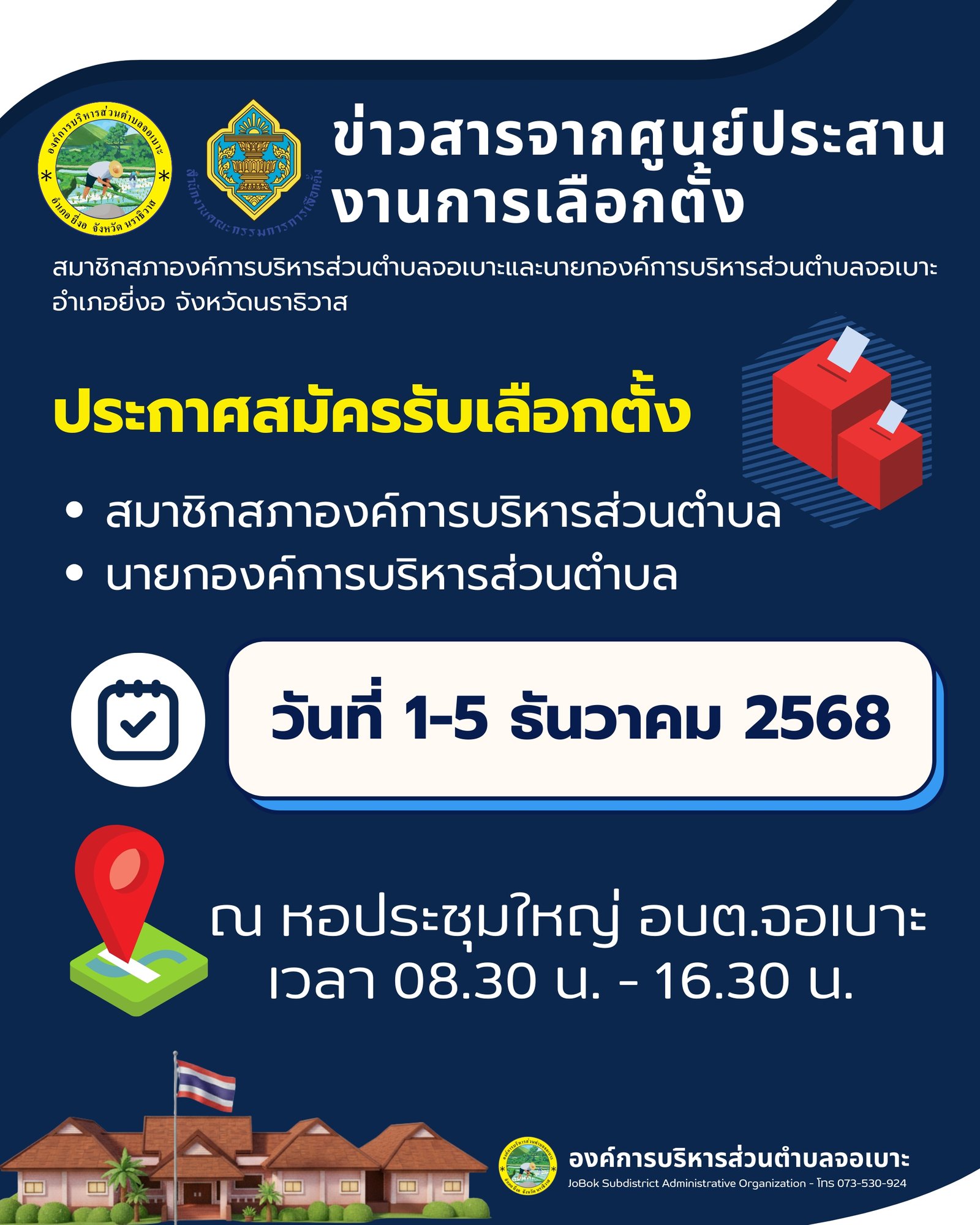 ประกาศองค์การบริหารส่วนตำบลจอเบาะ เรื่อง รับสมัครบุคคลเพื่อสรรหาและเลือกสรรเป็นพนักงานจ้างขององค์การบริหารส่วนตำบลจอเบาะ ประจำปีงบประมาณ พ.ศ. 2569
