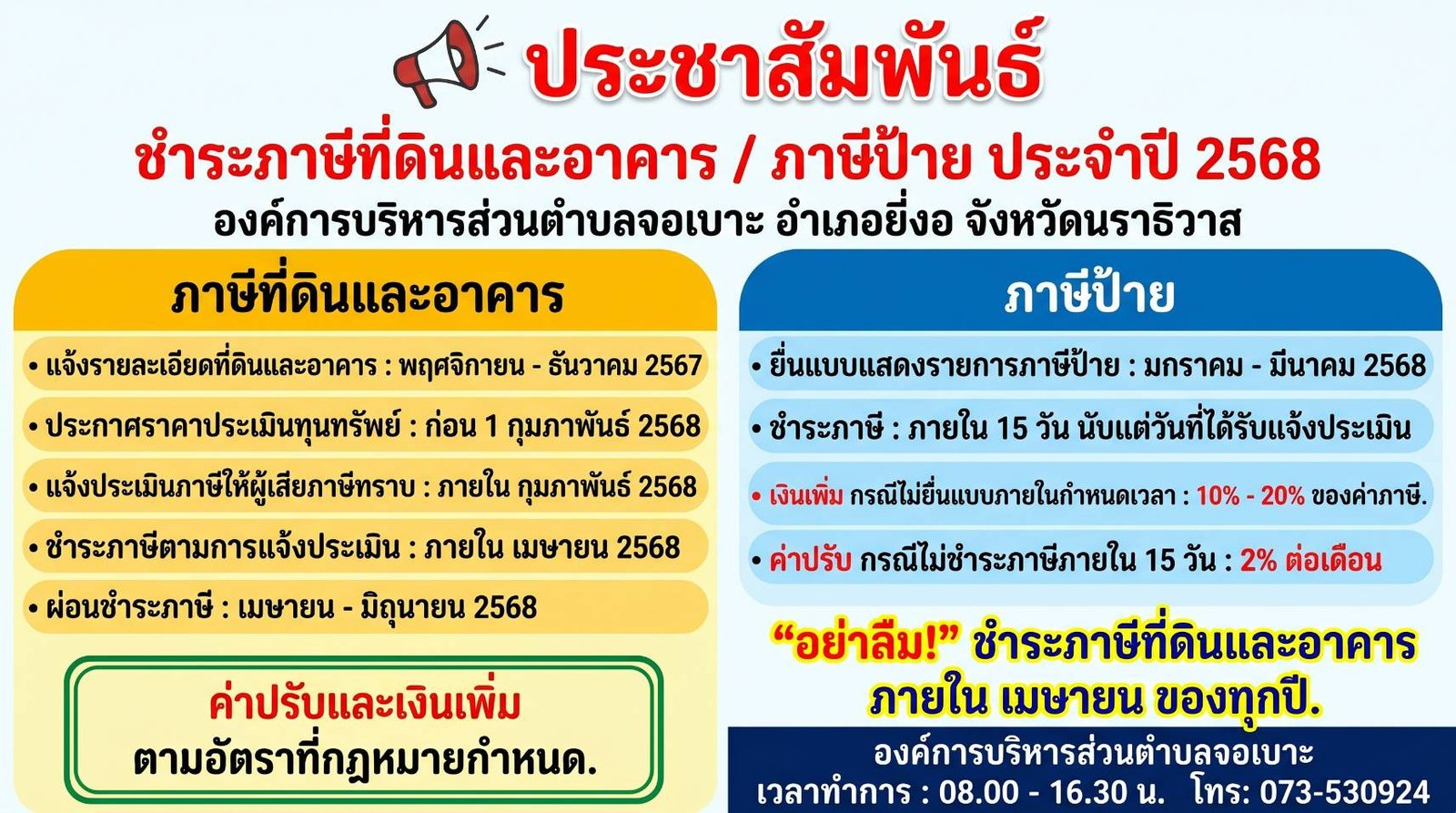 องค์การบริหารส่วนตำบลจอเบาะ อำเภอยี่งอ จังหวัดนราธิวาส ขอแจ้งประชาสัมพันธ์กำหนดการดำเนินการด้าน ภาษีที่ดินและสิ่งปลูกสร้าง และ ภาษีป้าย ประจำปี พ.ศ. 2568 เพื่อให้ประชาชนผู้มีหน้าที่เสียภาษีได้เตรียมความพร้อมและดำเนินการให้ถูกต้องตามระเบียบ